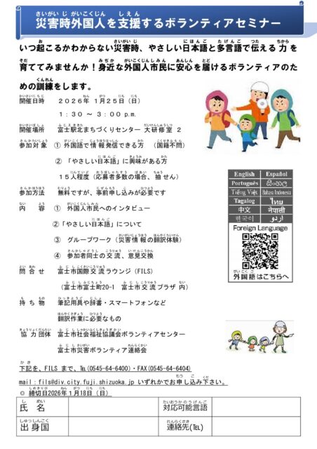 いつ起こるかわからない災害時、やさしい日本語と多言語で伝える力を育ててみませんか!身近な外国人市民に安心を届けるボランティアのための訓練をします。